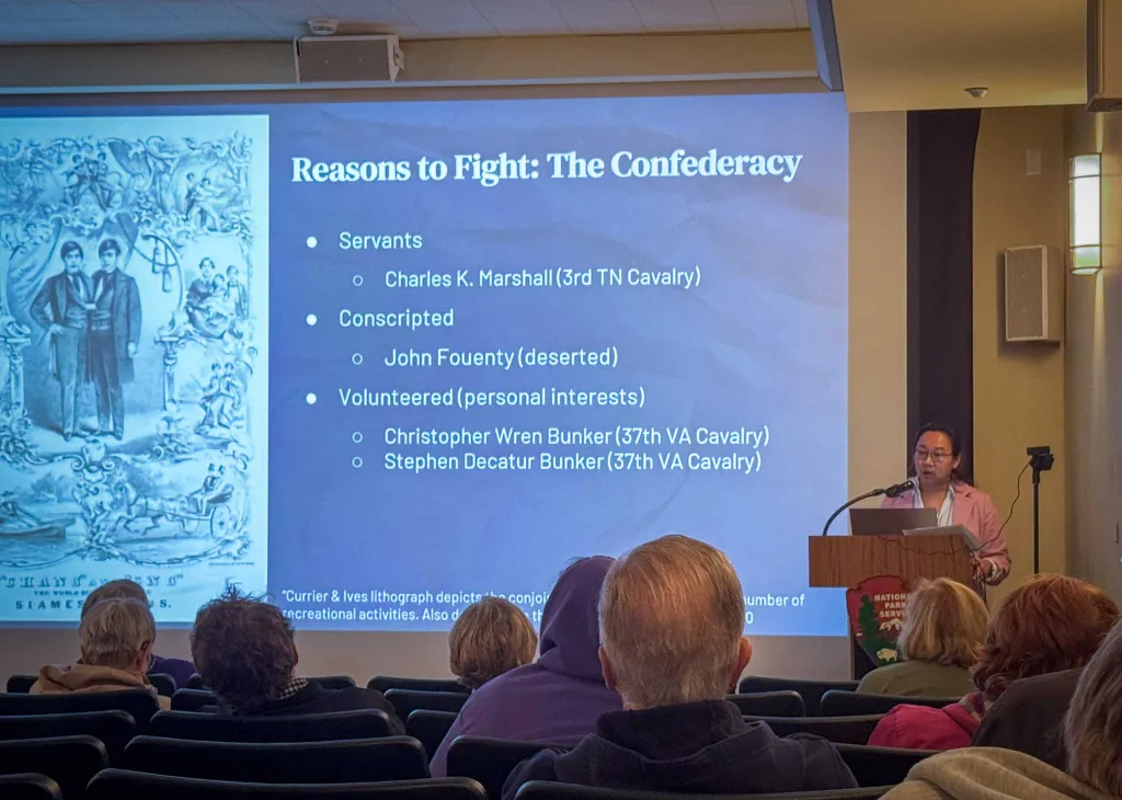 Angela He presents a lecture at the Grant National Historic Site. This talk was part of the event, "Discovering History: Ulysses S. Grant, China, and Chinese Americans in the Civil War," which took place April 19, 2025 at the Ulysses S. Grant National Historic Site. Photo courtesy of Angela He.