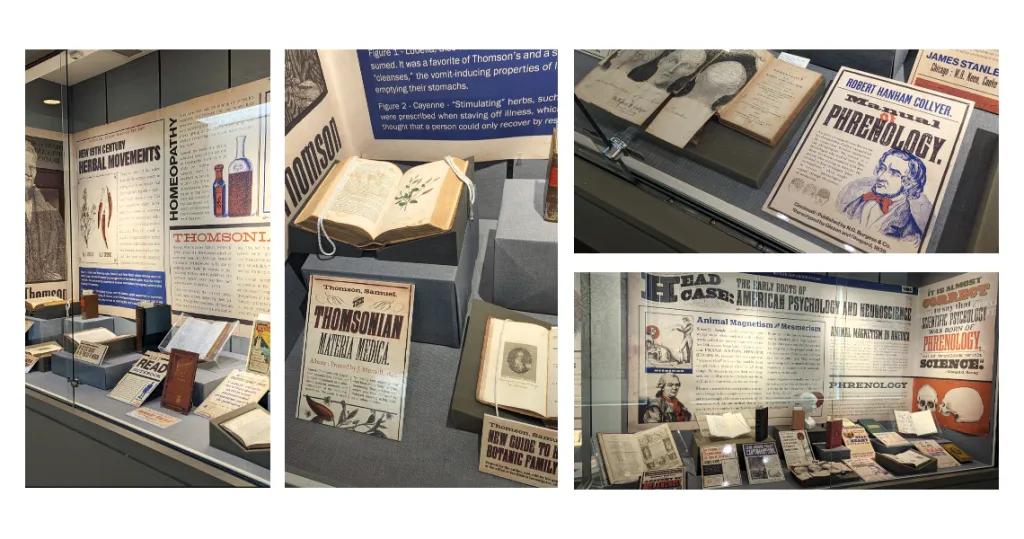 Images from He's solo exhibition, "The Novel Nineteenth Century: Trends, Treatments, and Technologies in Nineteenth Century American Medicine".  This case focused on animal magnetism and phrenology, and how they relate to modern psychiatry and neuroscience. Photos courtesy Angela He.